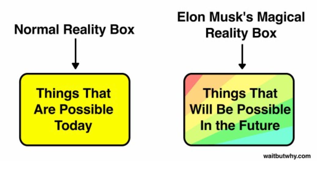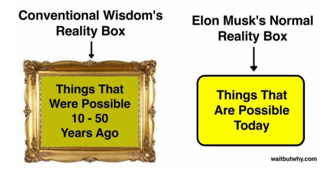 La réalité de la “sagesse conventionnelle” représente les choses qui étaient possibles il y a 10-50 ans, tandis que la “boîte à réalité normale” de Musk représente les choses qui sont possibles aujourd’hui.