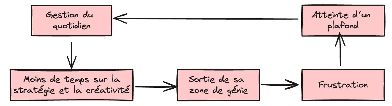 La passion, le dynamisme et la créativité de l’entrepreneur visionnaire sont les éléments clés qui lui permettent de lancer l’entreprise et d’alimenter la croissance des débuts. Mais au fur et à mesure que l’entreprise se développe, la charge de travail devient plus importante et le quotidien prend de plus en plus de place. Le visionnaire entre dans un cercle vicieux :